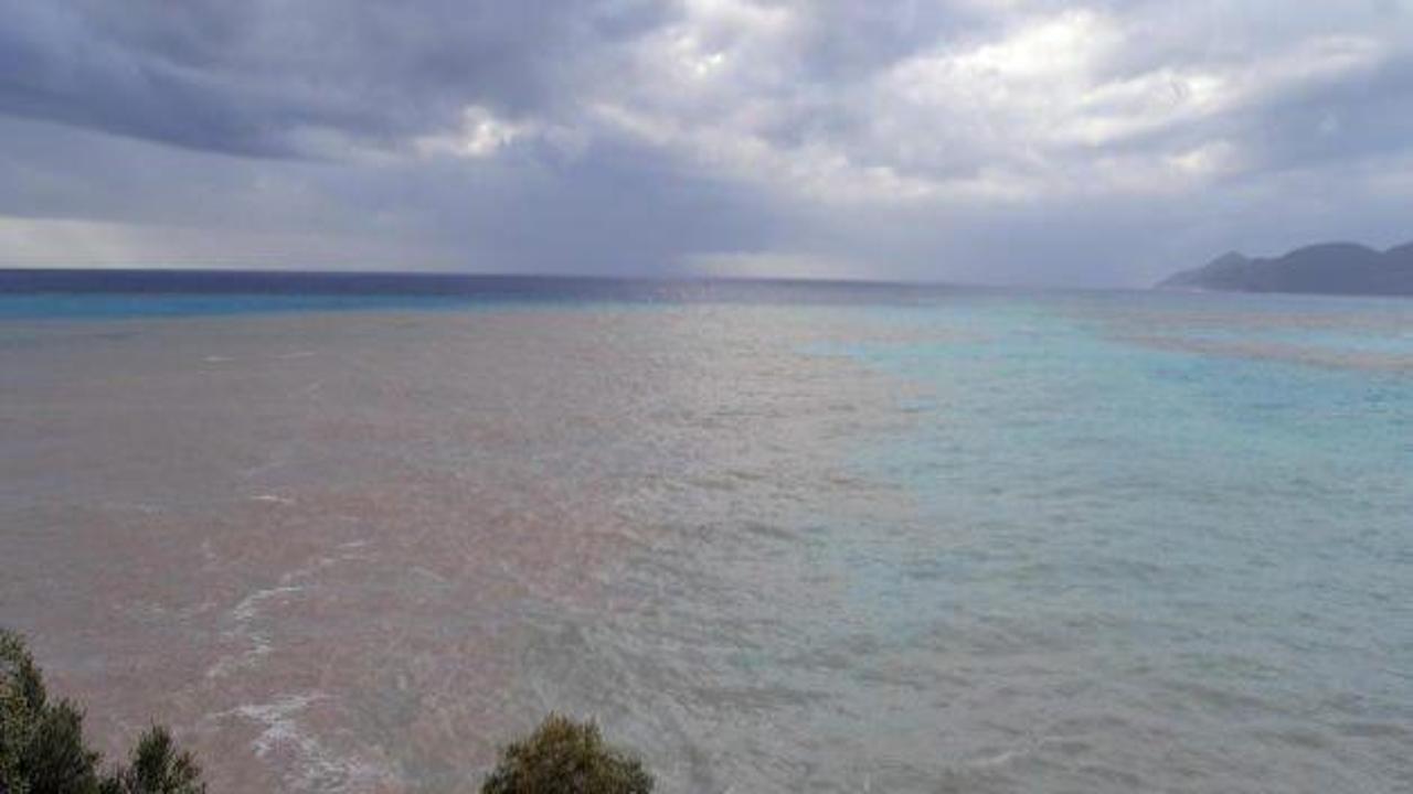 Fethiye'de etkili olan yağışın ardından yağmur suyu kanallarından akan çamurlu su, Ölüdeniz'in dünyaca ünlü Belcekız Plajı'nın yüzeyinde kızıl renk oluşmasına neden oldu.