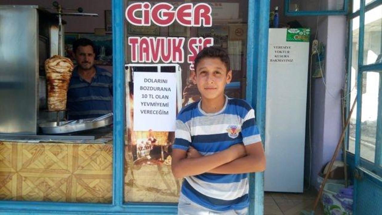 İlçenin Karacurun Mahallesi'ndeki bir dönercide 10 lira yevmiye ile çalışan 12 yaşındaki Mehmet Akif Gelez, dükkan camına astığı notta, dolarını bozdurup makbuzunu getiren bir kişiye bir günlük yevmiyesini vereceğini belirterek duyarlılığını gösterdi.