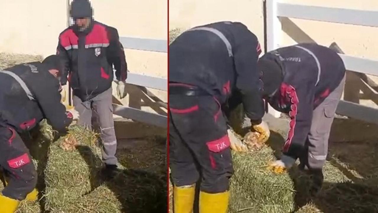Görüntülerde atlar için dışardan getirilen yonca balyalarını indiren görevlilerin, balya içerisine dev taşlar koyduktan sonra üzerini tekrar yonca ile kapattıkları görüldü.