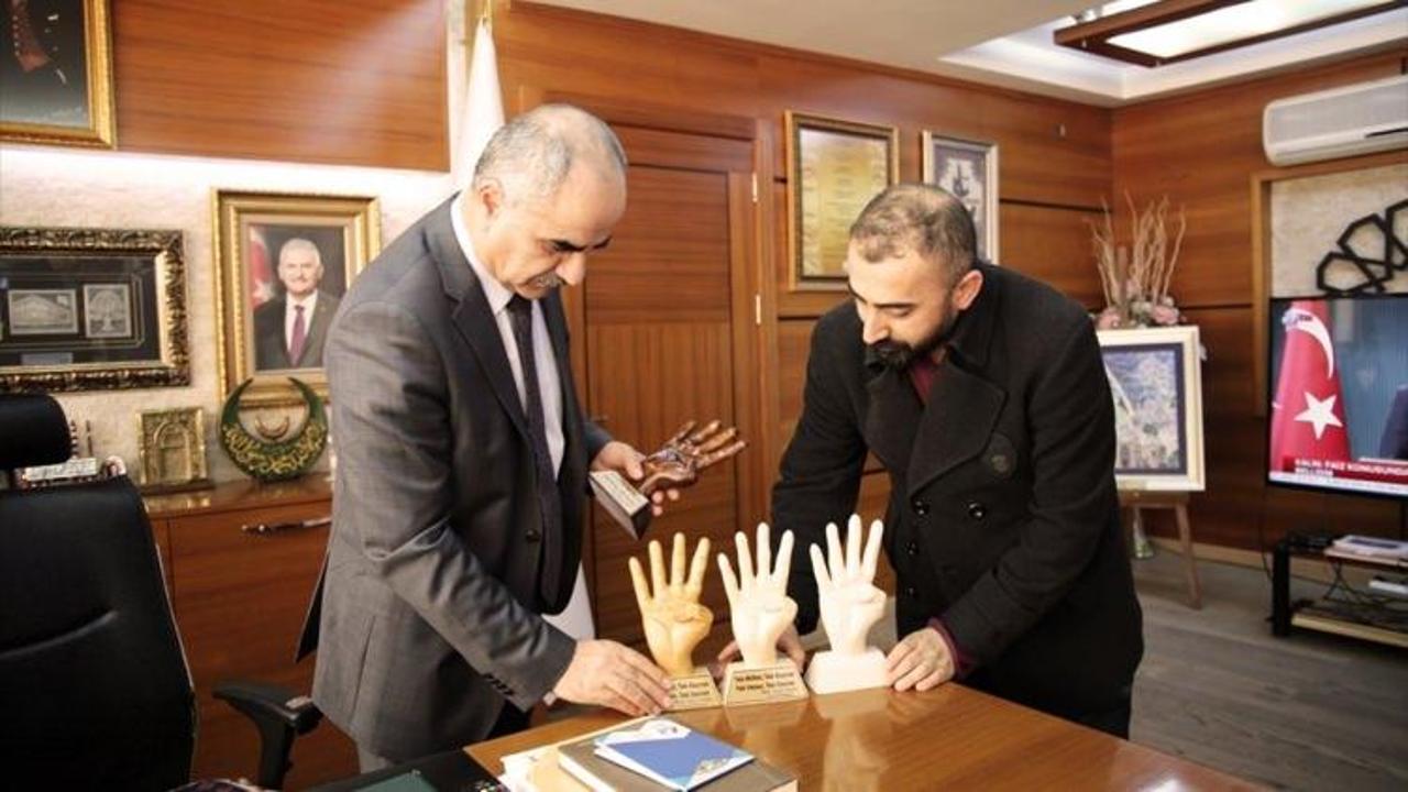 Başkan Aydın da ziyaretten duyduğu memnuniyeti dile getirerek, ahşap oyma Rabia figürünü masasına yerleştirdi.