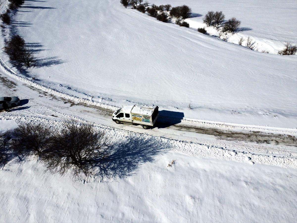 Kırsal mahallelerde kar nedeniyle ulaşıma kapanan yollar iş makineleriyle açıldıktan sonra ekipler, sokak hayvanları için de belirlenen noktalara mama, ekmek ve kemik bırakıyor.