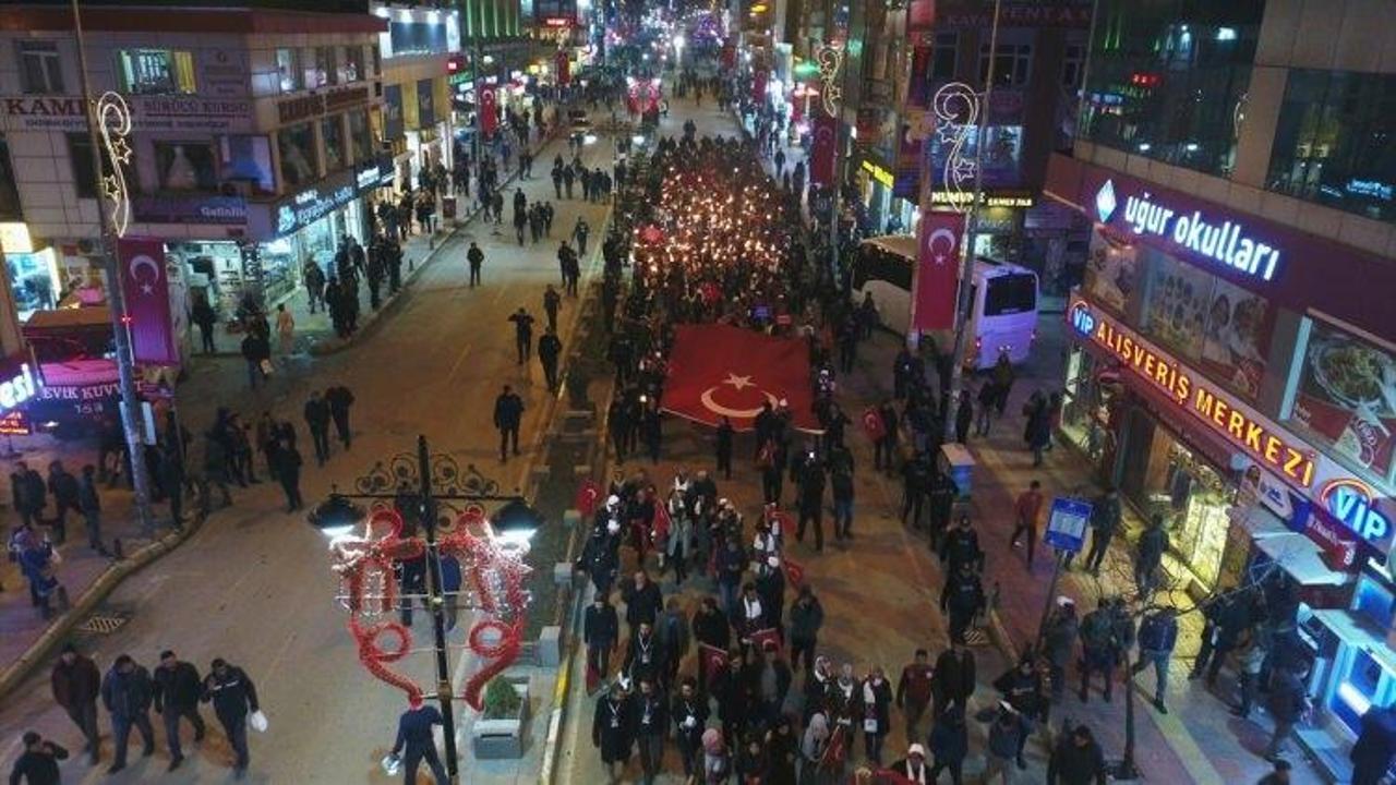 Meşaleler ile yürüyüş yapan 120 Vanlı genç, dev Türk Bayrağı açtı.