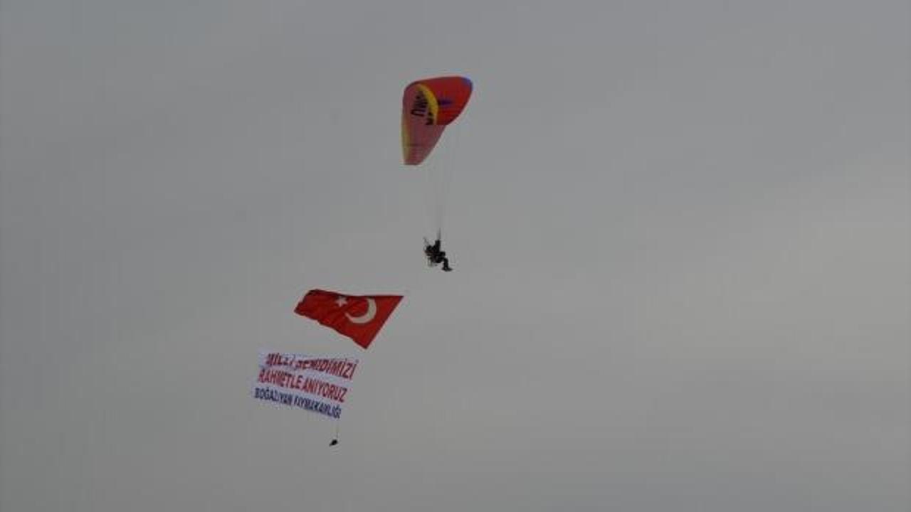 Motorlu Yamaç Paraşütü pilotunun gökyüzünde açtığı "Türk Bayrağı ve Milli Şehidimizi Rahmetle Anıyoruz" pankartını büyük beğeni topladı.