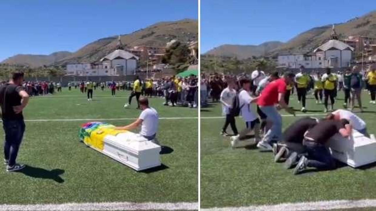 Takımın antrenman tesisine getirilen ve 'Andrea' isimli bir kişiye ait olduğu belirtilen tabutun üzerinde Palermo'ya ait formalarda vardı.