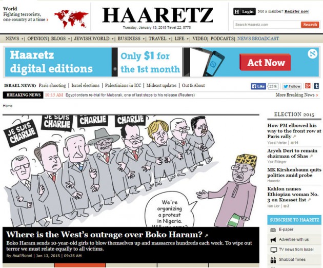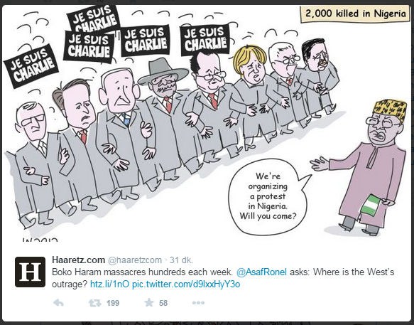 İsrail'in Haaretz Gazetesi yazarlarından Asaf Ronel, yayımladığı bir makalede Paris'teki saldırılara tepki gösteren batının Nijerya'da 2 bin insanın öldürüldüğü Boko Haram saldırısında aynı tepkiyi göstermediğini yazdı.