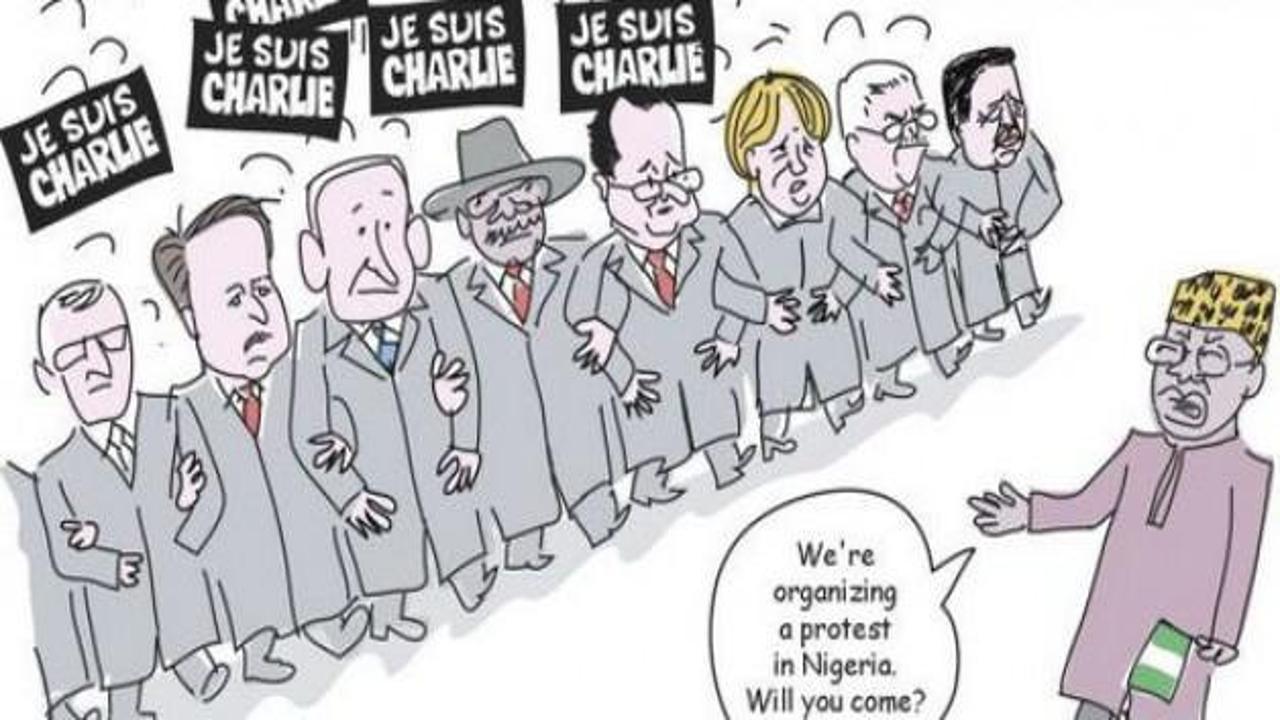 Gazete, makale ile bir de Amos Biderman imzalı bir karikatür yayımladı. Liderlerin Paris'teki Cumhuriyet Yürüyüşü'nde yan yana yürüdükleri bir anın karikatürize edildiği çalışmada, Nijerya Devlet Başkanı Goodluck Jonathan'ın Nijerya'da bir protesto organize ediyoruz, gelir misiniz diye sorduğu görülüyor.