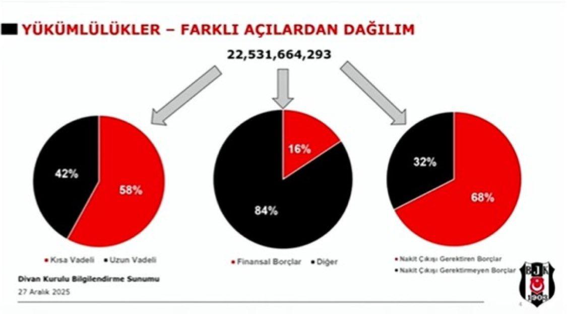 Beşiktaş Kulübünün borcunun, 31 Ağustos 2025 tarihi itibarıyla 22 milyar 531 milyon 664 bin 293 lira olduğu duyuruldu.