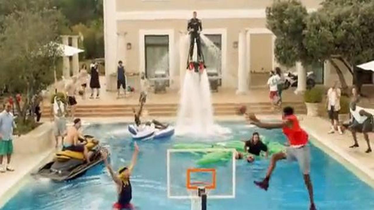 Ünlü basketbolcuların yer aldığı reklam filminde sporcular basketbol topu ile estetik hareketler yaptıktan sonra havuzun içinde yer alan potaya smaç basıyor.