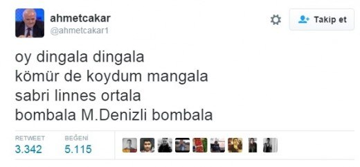 Ahmet Çakar yaptığı paylaşımda ‘Oy Dingala’ şarkısını Mustafa Denizli’ye uyarlarken “Oy dingala dingala. Kömür de koydum mangala. Sabri, Linnes ortala. Bombala Mustafa Denizli bombala” sözlerini kullandı.