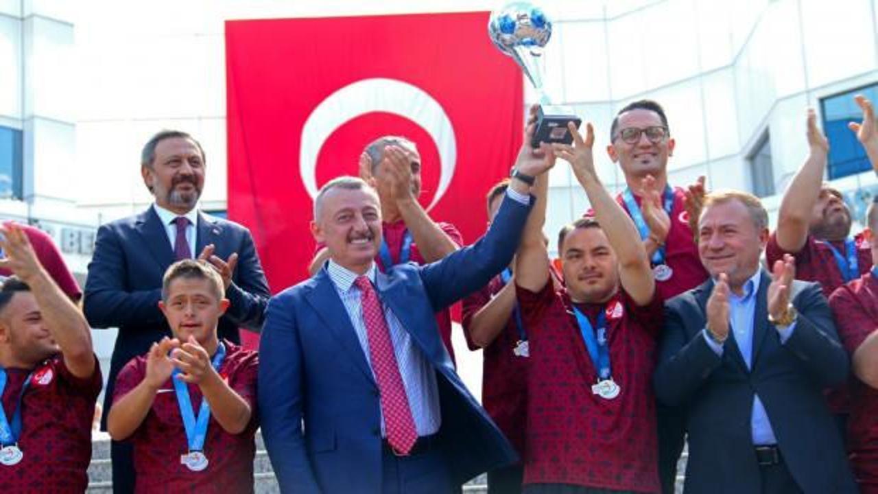 İtalya’daki Down Sendromlular Avrupa Şampiyonası’nda Portekiz’i yenerek şampiyon olan Down Sendromlular Özel Futsal Milli Takımı, kazandıkları kupayla birlikte Kocaeli Büyükşehir Belediyesini ziyaret etti. Mehteran Takımı ve Kağıtsporlu sporcular tarafından meşalelerle karşılanan Milli Takım için Büyükşehir Belediyesi ana hizmet binası önünde tören düzenlendi. Türkiye’nin gururu olan Down Sendromlular Özel Futsal Milli Takımı oyuncuları kazandıkları kupayı söz verdikleri gibi Kocaeli Büyükşehir Belediye Başkanı Tahir Büyükakın’a getirdi.