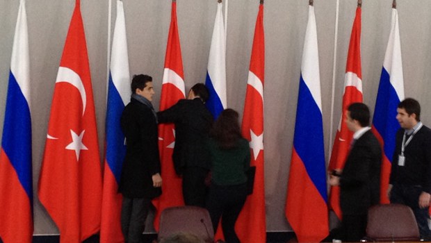 Basın toplantısının yapılacağı salonda iki liderin arkasına Rus yetkililer tarafından beşer Türk ve Rus bayrağı yerleştirildi. Ancak Türk bayrağında ay ve yıldız arka planda kalınca Türk Dışişleri yetkilileri müdahale etti.İki liderin salona girişine dakikalar kala bayraklarda düzenleme yapılarak ay ve yıldız ön plana çıkarıldı.
