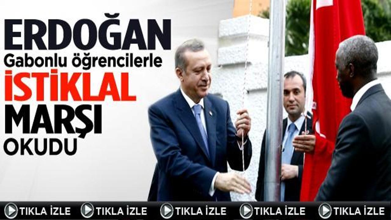 Türkiye'nin Lıbrevılle Büyükelçiliği Kançılarya binasının bayrak çekme törenine katılan Başbakan Erdoğan, burada Gabon'lu öğrencilerle İstiklal Marşını okudu. İşte o görüntüler...