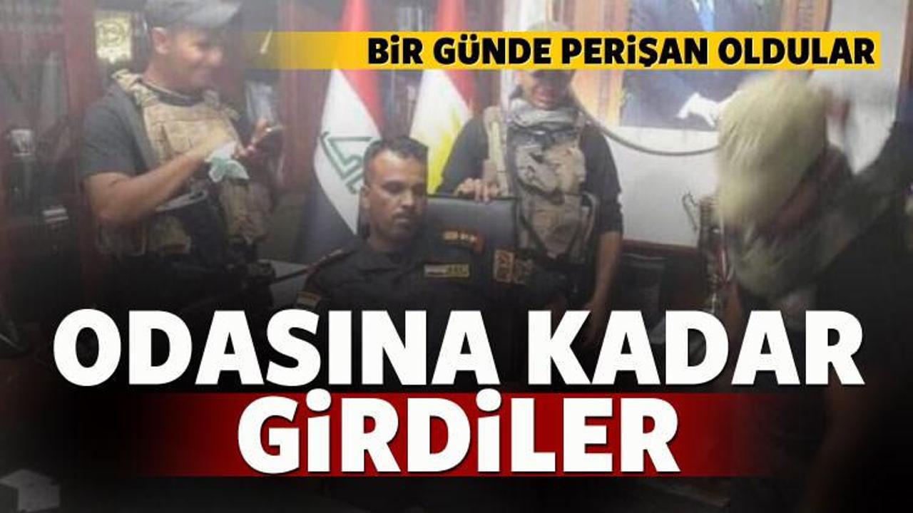 Valilik binasına giren Irak güçleri, Bağdat yönetiminin görevden almasına rağmen koltuğunu bırakmayan vali Necmettin Kerim'in makam odasında poz verdi.