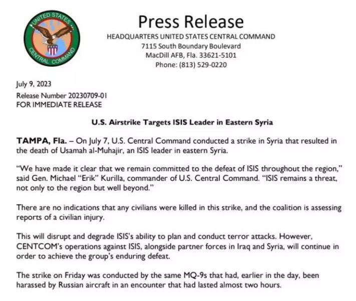 ABD Merkez Komutanlığı (CENTCOM) cuma günü Suriye'nin doğusuna hava saldırısı düzenlendiğini, saldırıda DAEŞ lideri Usame El Muhacir'in öldürüldüğünü duyurdu.
