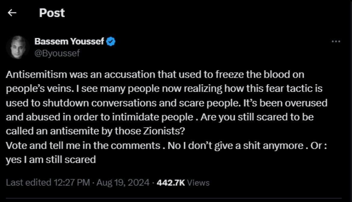 Çeviri: Antisemitizm halkın damarlarındaki kanı dondurmak için kullanılan bir suçlamadır. Artık birçok insanın bu korkunun konuşmaları susturmak ve insanları korkutmak için bir taktik olarak kullanıldığını anladığını görüyorum. İnsanları korkutmak için aşırı kullanıldı ve istismar edildi. Hala Siyonistlerin seni antisemit olarak adlandırılmasından mı korkuyor musun? Oy verin ve yorumlarda bana bildirin. Hayır artık umurumda değil ya da evet hala korkuyorum.