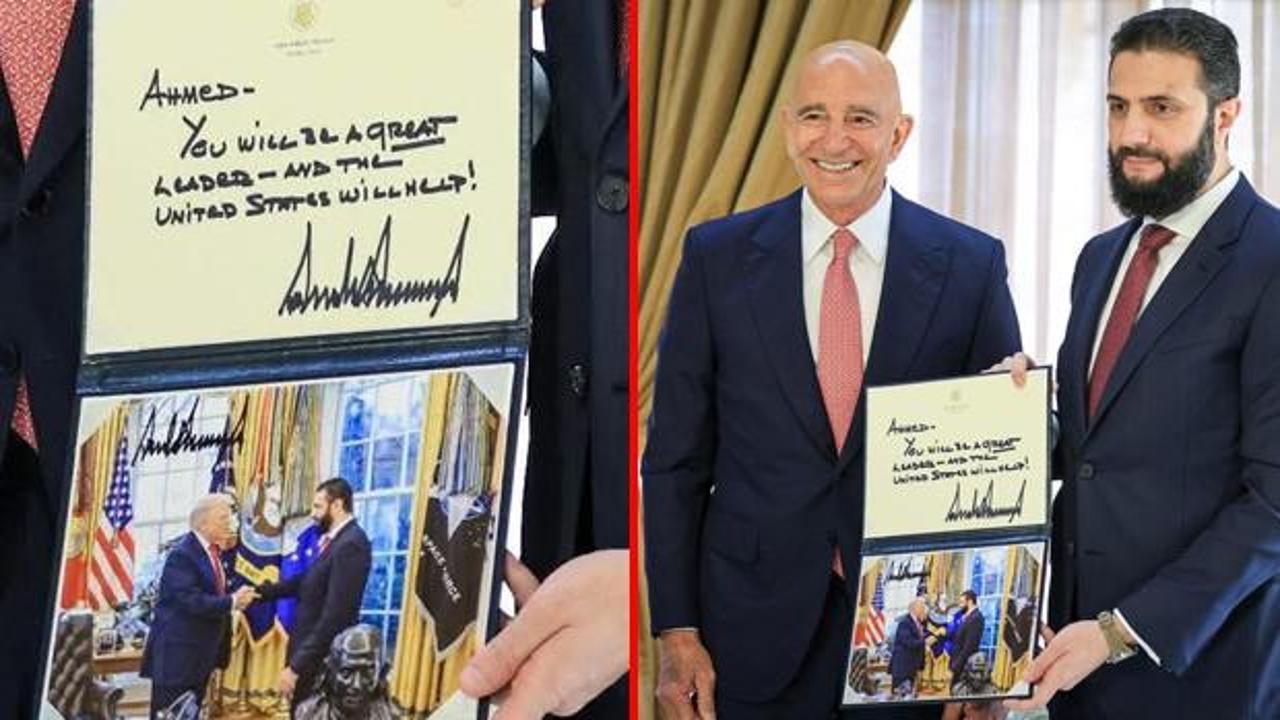 ABD Başkanı Donald Trump'ın, Türkiye Büyükelçisi ve Suriye Özel Temsilcisi Tom Barrack aracılığıyla Suriye Cumhurbaşkanı Ahmed Şara'ya gönderdiği hediyede, "Ahmed! Sen harika bir lider olacaksın ve ABD sana yardım edecek!" yazdığı görüldü.