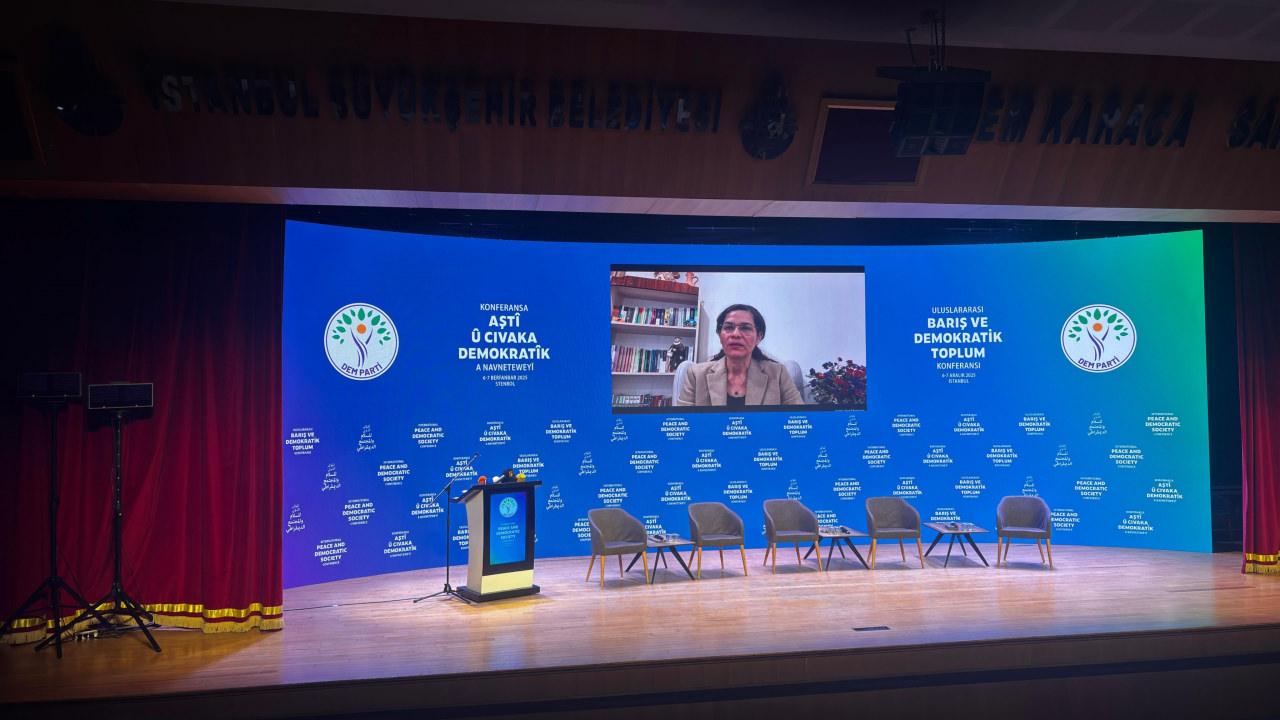 DEM Parti'nin İstanbul'da düzenlediği "Uluslararası Barış ve Demokratik Toplum Konferansı"na, terör örgütü PKK/YPG'nin uzantısı Suriye Demokratik Güçleri'nin (SDG) Dış İlişkiler Sorumlusu İlham Ahmed de çevrimiçi katıldı.