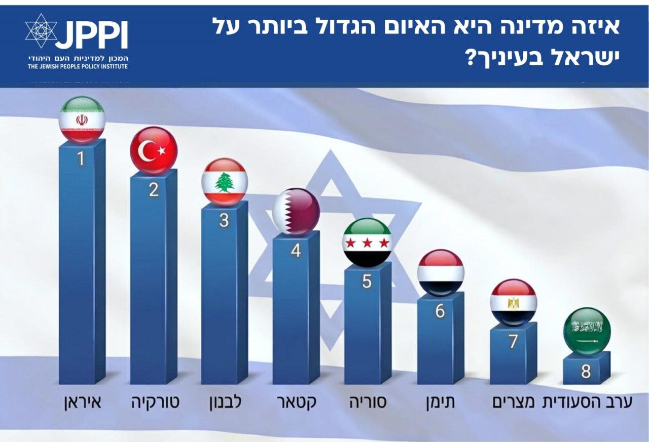 İsrail merkezli anket şirketi JPPI tarafından hazırlanan ankette İsrail varlığına tehdit olan ülkeler listelendi. Listede İran ilk sırada yer alırken Türkiye ise ikinci sırada yer aldı.