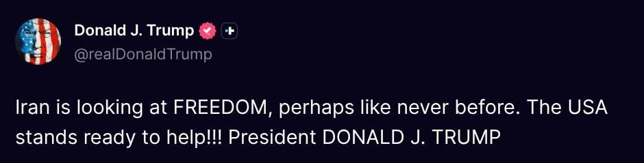 ABD Başkanı, İran'da bir süredir devam eden gösterilere dikkati çektiği diğer paylaşımında, ABD'nin İran halkına "yardıma hazır olduğunu" belirtti.