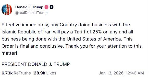 İran ile iş yapan ülkelerin ABD ile olan ticaretlerinde yüzde 25 oranında gümrük vergisi ödeyeceğini belirten Trump, söz konusu kararın derhal yürürlüğe girdiğini belirtti.