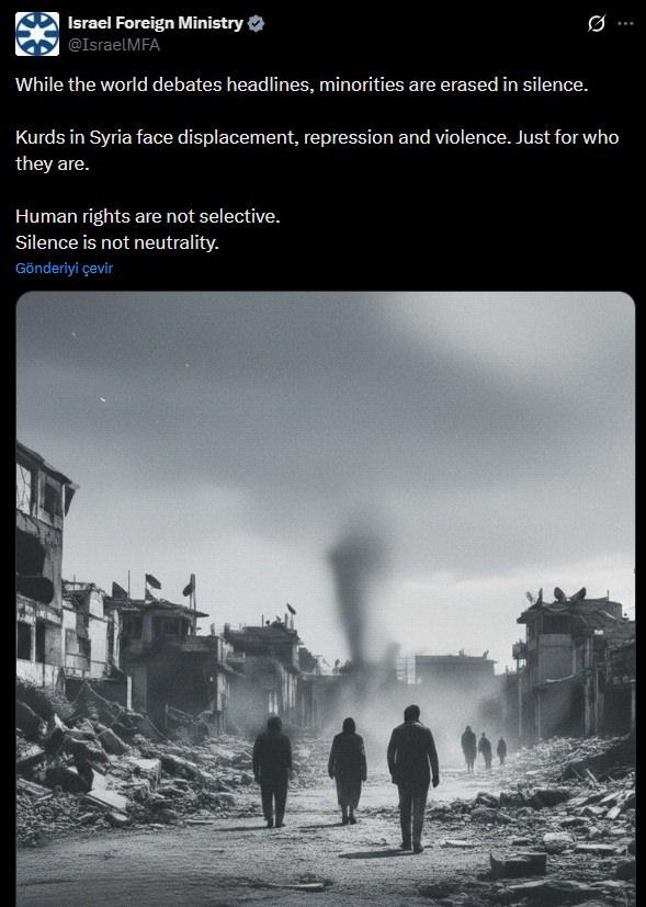 İsrail, terör örgütü SDG/PKK'ya desteğini bir kez daha açık etti. İsrail Dışişleri Bakanlığından yapılan açıklamada, 'azınlık' olarak lanse edilen SDG'nin 'baskı ve şiddetle karşı karşıya kaldığı' iddiasıyla bir paylaşım yapıldı.