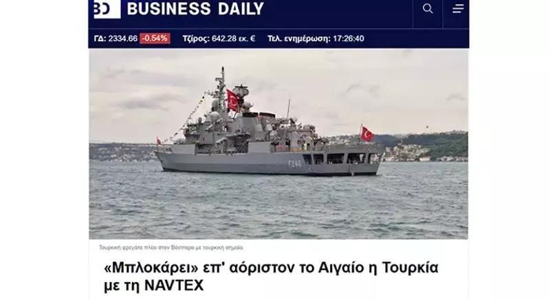 Farklı bir Yunan medyası Business Daily de, Türkiye'nin süresiz NAVTEX açıklamasını manşetine taşıdı.