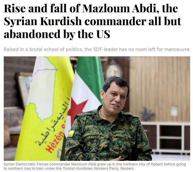 SDG Sözde Lideri Mazlum Abdi’nin Suriye’de uğradığı yenilgi sonrası bölgedeki hayallerinin yıkıldığı ve ABD'nin siyasi olarak destek vermemesinden dolayı rahatsızlık duyduğu belirtildi.