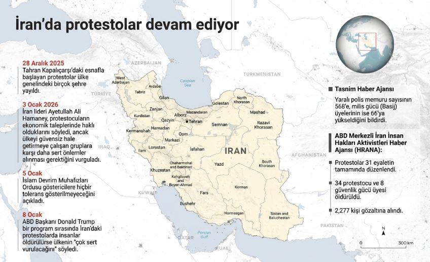 - İran'da 28 Aralık 2025'te başlayan protestolar, yerel para biriminin değer kaybetmesi ve ekonomik sıkıntıların derinleşmesi nedeniyle yaygınlaştı; yönetim, protestolar sırasında internet erişimini engelledi ve emniyet güçleri müdahalede bulundu.