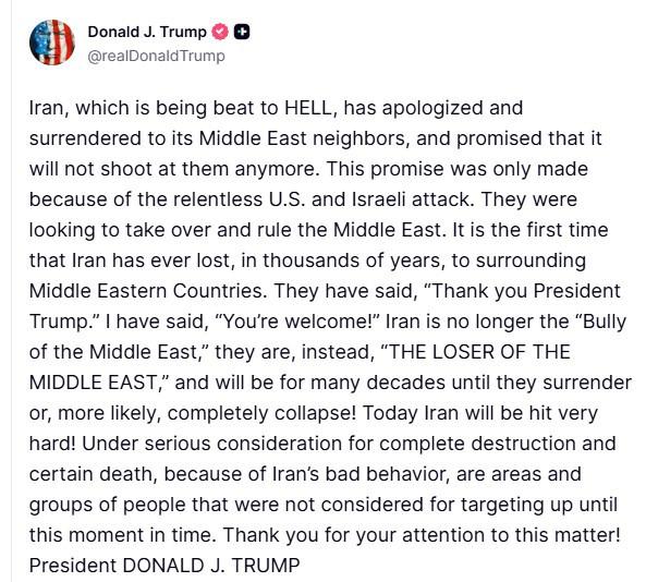 Trump, İran Cumhurbaşkanı Mesud Pezeşkiyan'ın saldırılar nedeniyle komşu ülkelerinden özür dilemesine değinerek, "Ağır darbeler alan İran, Orta Doğu'daki komşularından özür dileyerek teslim oldu ve artık onlara ateş açmayacağına söz verdi. Bu söz, ABD ve İsrail'in amansız saldırıları sonucu verildi. Orta Doğu'yu ele geçirip yönetmeyi hedefliyorlardı. İran, binlerce yıldır ilk kez çevresindeki Orta Doğu ülkelerine yenildi. İran artık 'Orta Doğu’nun zorbası' değil, aksine 'Orta Doğu'nun kaybedenidir ve teslim olana veya daha büyük ihtimalle tamamen çökene kadar uzun yıllar boyunca böyle kalacaktır" ifadelerini kullandı.