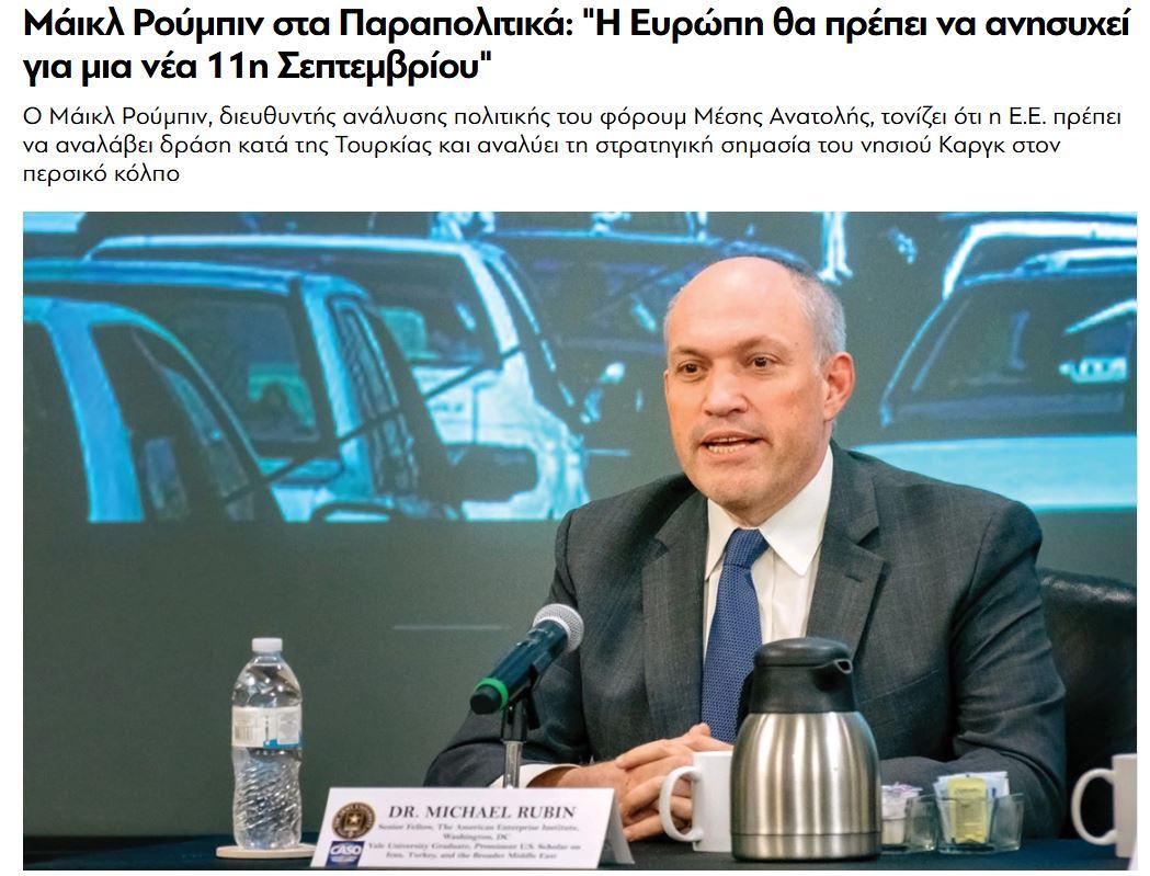 Ortadoğu Forumu’nda politika analizi direktörü olarak konuşan Rubin, Yunan basınına verdiği demeçte AB’nin Türkiye’ye karşı harekete geçmesi gerektiğini belirterek Basra Körfezi’ndeki Harg Adası’nın stratejik önemini analiz etti.