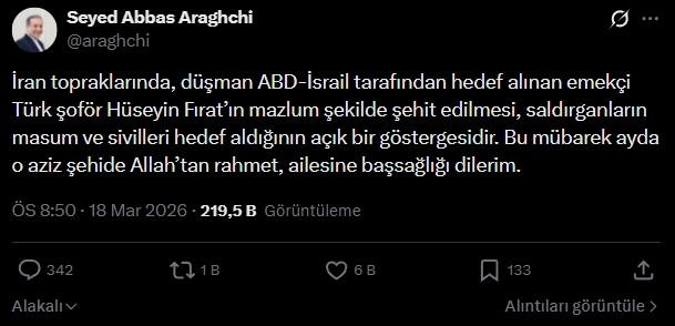 İran Dışişleri Bakanı Abbas Arakçi, ABD ve İsrail saldırılarında hayatını kaybeden Türk tır şoförü Hüseyin Fırat için Türkçe taziye mesajı yayımlayarak Fırat’ın ailesine başsağlığı diledi.