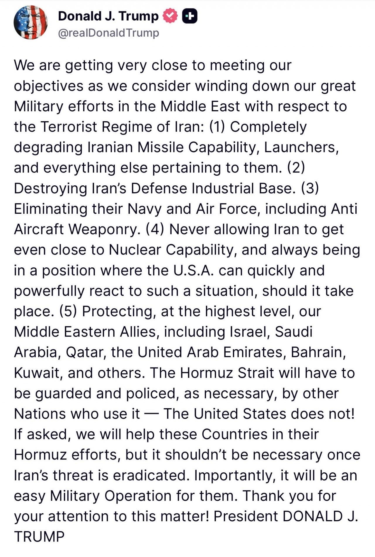 Trump Truth Social hesabından ise, İran'ın Hürmüz Boğazı'nı kapatmaya devam etmesi durumunda bile ABD'nin savaş çabalarını sona erdirebileceğini sözlerine ekleyerek, "İran'ın terörist rejimine ilişkin Ortadoğu'daki büyük askeri çabalarımızı azaltmayı düşündüğümüz şu günlerde, hedeflerimize ulaşmaya çok yaklaştık" diye açıkladı.