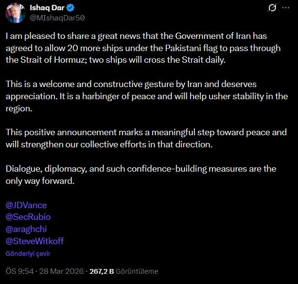 Pakistan Dışişleri Bakanı Dar, paylaşımında ABD Başkan Yardımcısı JD Vance, Dışişleri Bakanı Marco Rubio, İran Dışişleri Bakanı Abbas Erakçi ve ABD Başkanı Donald Trump'ın Özel Temsilcisi Steve Witkoff'u etiketledi.