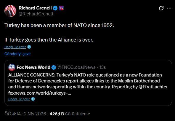 ABD Ulusal İstihbarat Yetkilisi Richard Grenell ise Ciddi'nin açıklamalarına karşı çıkarak Türkiye'nin ittifaktan ayrılması halinde NATO'nun tamamen sona ereceğini belirtti.