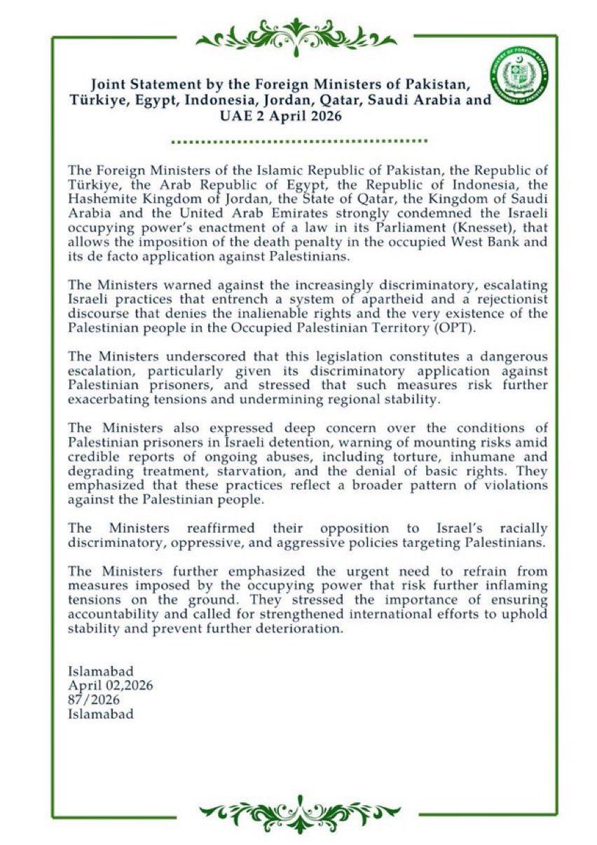 İslam Cumhuriyeti Pakistan, Türkiye Cumhuriyeti, Mısır Arap Cumhuriyeti, Endonezya Cumhuriyeti, Ürdün Haşimi Krallığı, Katar Devleti, Suudi Arabistan Krallığı ve Birleşik Arap Emirlikleri Dışişleri Bakanları; İsrail işgal gücünün parlamentosunda (Knesset) kabul ettiği, işgal altındaki Batı Şeria’da idam cezasının uygulanmasına ve fiilen Filistinlilere karşı tatbik edilmesine olanak tanıyan yasayı şiddetle kınamıştır.