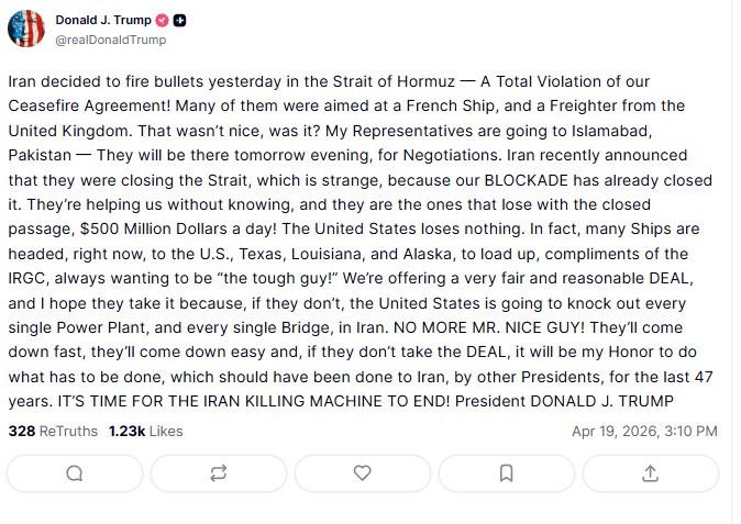 - Trump, Amerikan heyetinin Pakistan'a doğru yola çıktığını ve masadaki teklifin adil olduğunu, İran'ın reddetmesi durumunda sert sonuçlar doğurabileceğini vurguladı.