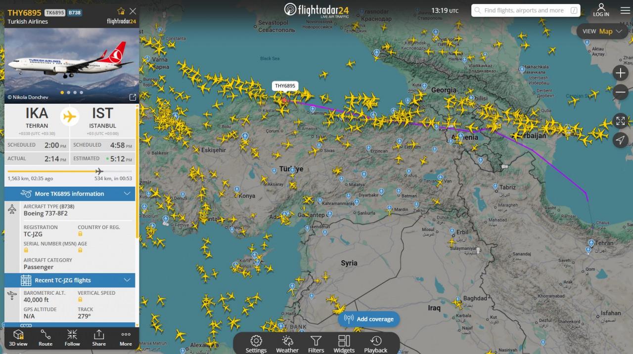 İran hava sahasının kısmen açılmasının ardından, THY'nin "TC-JZG" kuyruk tescilli Boeing 737-800 tipi uçağı, yerel saatle saat 14.00'te Tahran Havalimanı'ndan kalktı.