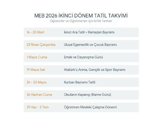 Açıklanan takvimle birlikte ikinci döneme ilişkin tüm tatil ve çalışma günleri netleşmiş oldu.
