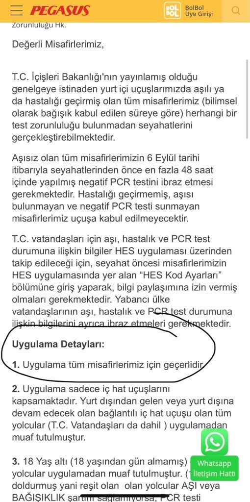 Korona virüs önlemleri kapsamında aşısız veya hastalığı geçirmemiş yolculara negatif sonuçlu PCR testi bulundurma zorunluluğu başladı. Hava yolu şirketi Pegasus'un bir sosyal medya kullanıcısına attığı mesaj ise tepkilere neden oldu. Tepkiler sonrası Pegasus geri adım attı.