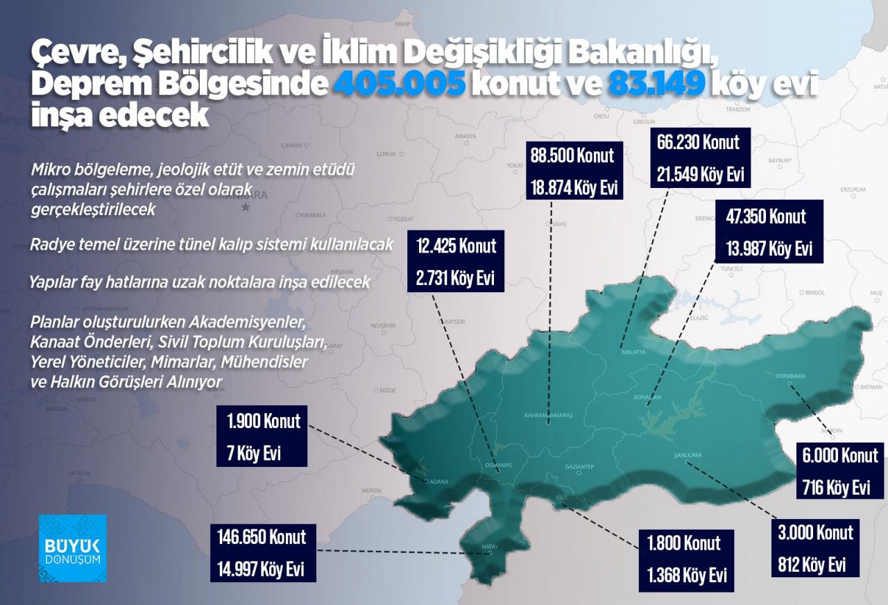 Bu kapsamda, belirlenen yeni alanlarda TOKİ eliyle ilk etapta Kahramanmaraş'ta 45 bin 67, Malatya'da 44 bin 770, Hatay'da 40 bin 426, Adıyaman'da 25 bin 882, Gaziantep'te 18 bin 544, Osmaniye'de 9 bin 550, Diyarbakır'da 6 bin, Elazığ'da 3 bin 750, Şanlıurfa'da 3 bin, Adana'da 2 bin 200 ve Kilis'te 250 konut olmak üzere 199 bin 739 konut inşa edilecek.