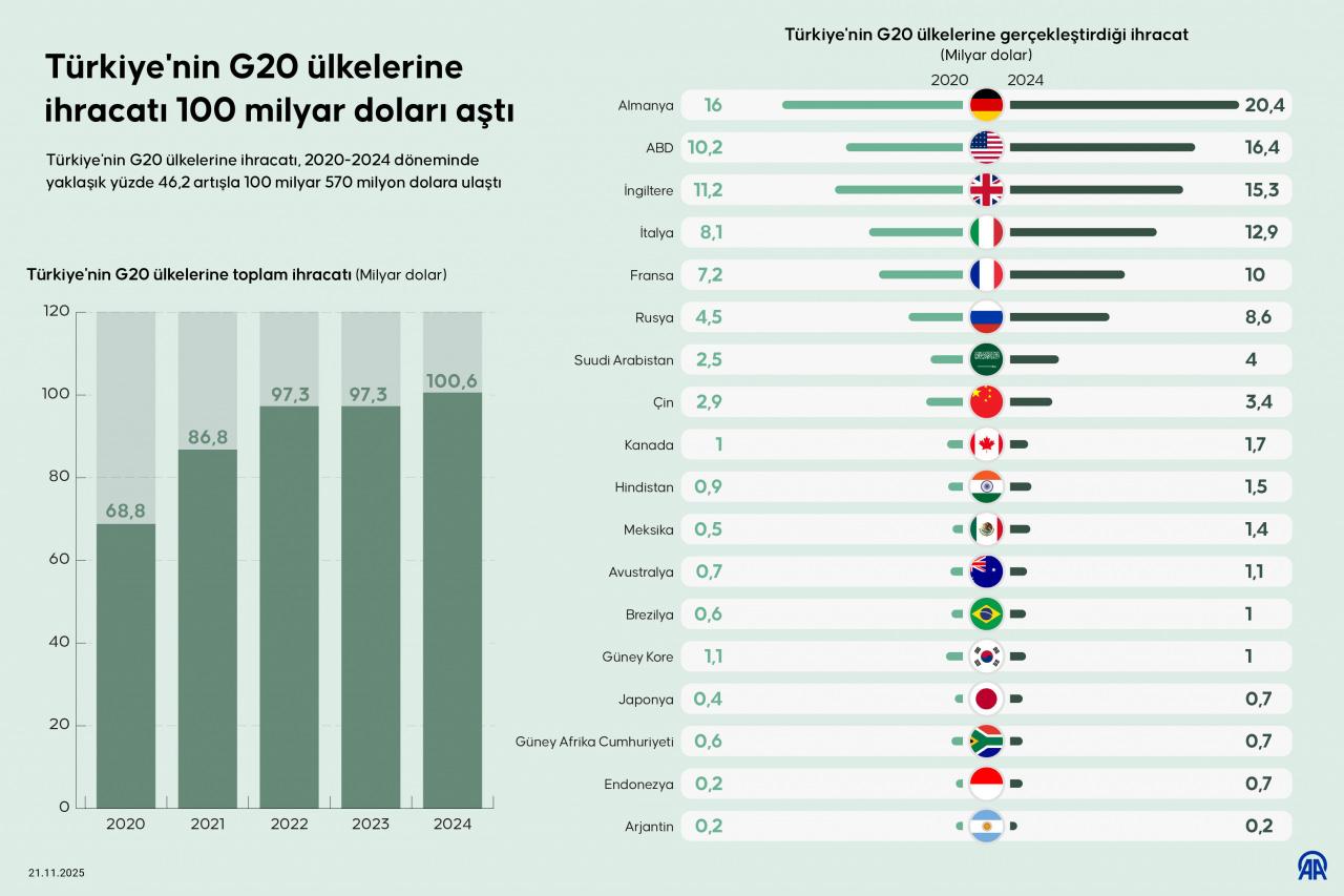 Türkiye, G20'ye üye 18 ülkeye 2020'de 68 milyar 789 milyon dolarlık ürün ihracatı gerçekleştirdi. Söz konusu ihracat, 2021'de 86 milyar 780 milyon doları bulurken, 2022'de 97 milyar 322 milyon dolar, 2023'te de 97 milyar 250 milyon dolar oldu.