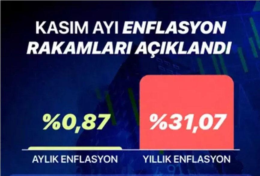 Türkiye İstatistik Kurumunun (TÜİK) açıkladığı kasım ay enflasyon verisi piyasa beklentilerinin altında geldi. Tüketici Fiyat Endeksi'ndeki (TÜFE) kasımda aylık bazda yüzde 0,87, Yurt İçi Üretici Fiyat Endeksi (Yİ-ÜFE) yüzde 0,84 artış gösterdi. Yıllık enflasyon, tüketici fiyatlarında yüzde 31,07, yurt içi üretici fiyatlarında yüzde 27,23 olarak kayıtlara geçti.