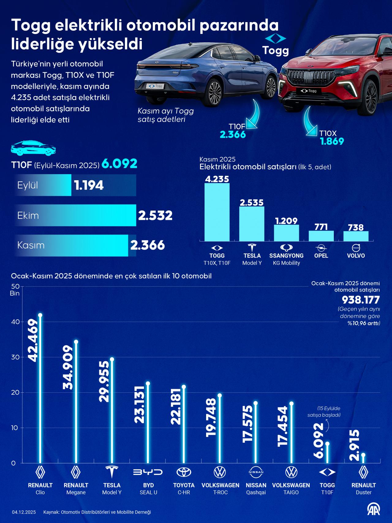 Yerli otomobil, geçen ay toplamda 4 bin 235'lik satışla elektrikli otomobil pazarında liderliğe yükselirken, T10F'in satış rakamı 2 bin 366, T10X'in ise 1869 oldu. Model bazında 2 bin 535'lik satışla Tesla Model Y ilk sırada yer aldı. Bu araçları 1209 ile KG Mobility (Ssangyong), 771 ile Opel, 738 ile Volvo izledi.