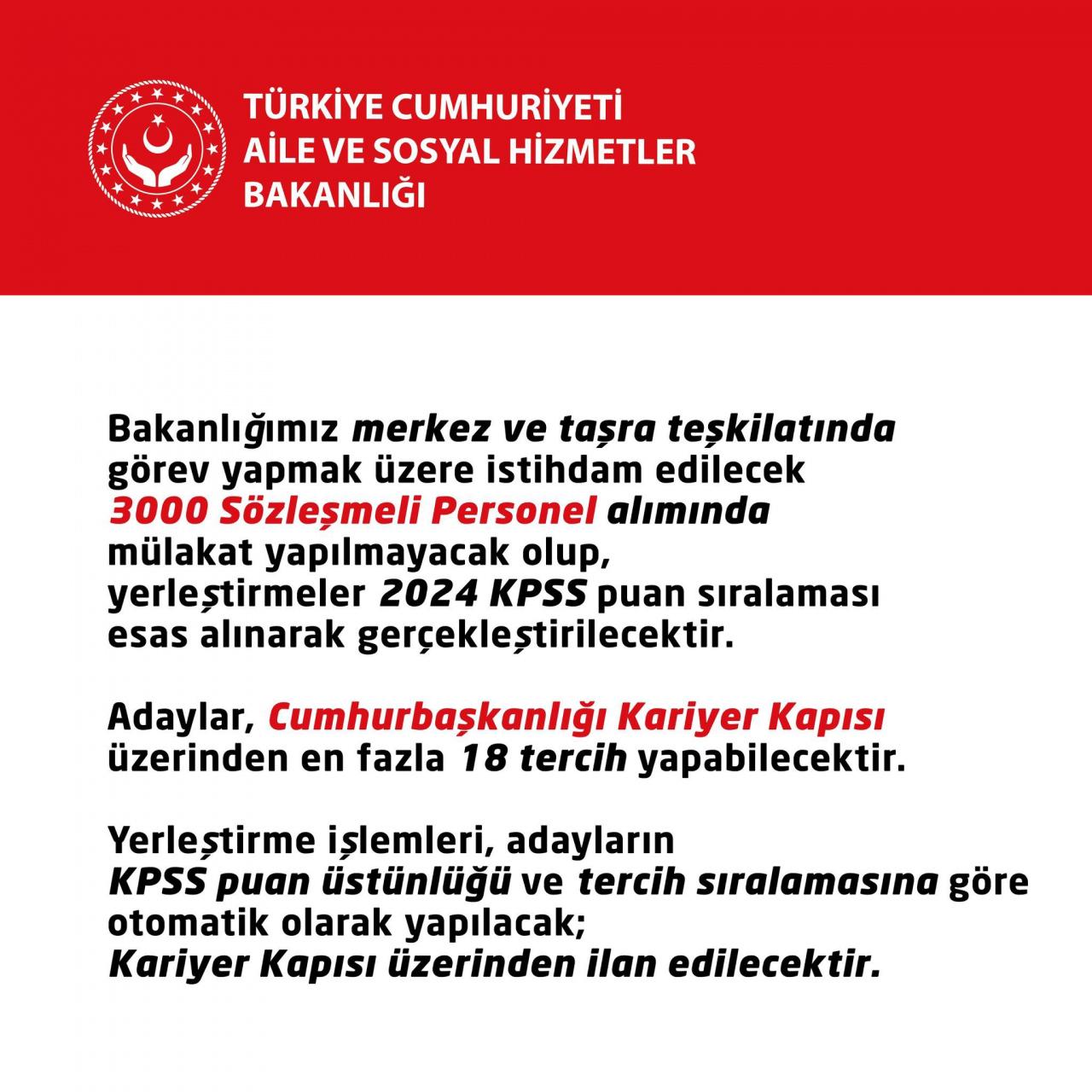 Aile ve Sosyal Hizmetler Bakanlığı, merkez ve taşra teşkilatında istihdam etmek üzere mülakatsız 3 bin sözleşmeli personel alacağını duyurdu. Atamalar, KPSS puan sıralamasına göre gerçekleştirilecek.