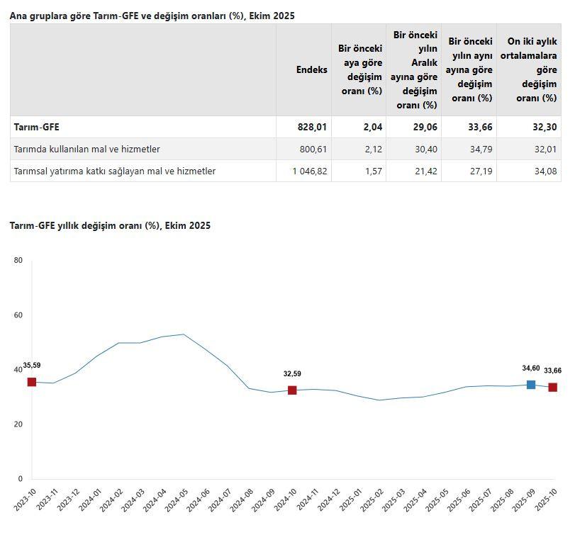 Buna göre, Tarım-GFE'de Ekim ayında bir önceki aya göre yüzde 2,04 artış, bir önceki yılın Aralık ayına göre yüzde 29,06 artış, bir önceki yılın aynı ayına göre yüzde 33,66 artış ve on iki aylık ortalamalara göre yüzde 32,30 artış gerçekleşti.