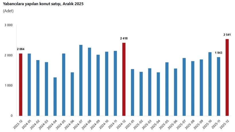 Yabancılara yapılan konut satışları Aralık ayında bir önceki yılın aynı ayına göre yüzde 5,1 oranında artarak 2 bin 541 oldu. Aralık ayında toplam konut satışları içinde yabancılara yapılan konut satışının payı yüzde 1,0 olarak gerçekleşti.