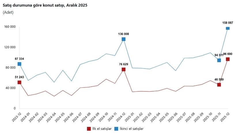 Türkiye genelinde ilk el konut satış sayısı Aralık ayında bir önceki yılın aynı ayına göre yüzde 26,2 oranında artarak 96 bin 690 oldu. İlk el konut satışları 2025 yılında bir önceki yıla göre yüzde 11,6 oranında artarak 540 bin 786 olarak gerçekleşti. Toplam konut satışları içinde ilk el konut satışlarının payı aralık ayında yüzde 38,0, 2025 yılında yüzde 32,0 oldu.