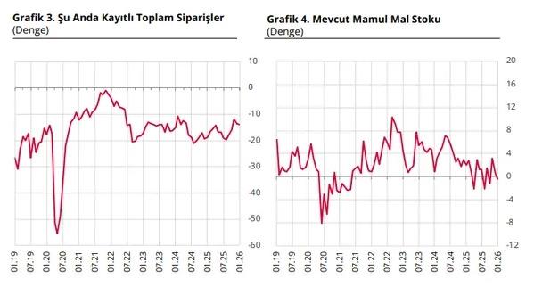 Mevcut toplam siparişlerin mevsim normallerinin altında olduğu yönündeki değerlendirmelerin bir önceki aya kıyasla bir miktar güçlendiği belirtildi. Mevcut mamul mal stoklarının mevsim normallerinin üzerinde olduğunu bildirenler lehine olan seyrin ise mevsim normallerinin altında olduğunu bildirenler lehine döndüğü ifade edildi.