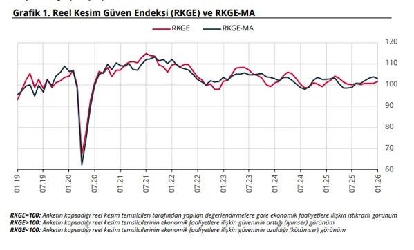 Türkiye Cumhuriyeti Merkez Bankası (TCMB) Reel Kesim Güven Endeksi verilerini yayımladı. Buna göre Ocak ayında reel kesimin ekonomiye güveni 103,0 seviyesinde gerçekleşti.
