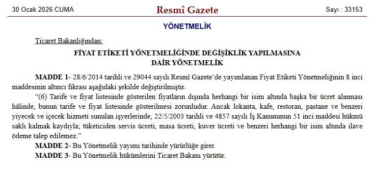 Buna göre lokanta, kafe, restoran ve pastane ile benzeri yiyecek ve içecek hizmeti sunulan iş yerleri artık tüketicilerden servis, masa, kuver ücreti ve benzeri herhangi bir isim altında ilave ödeme talep edemeyecek.